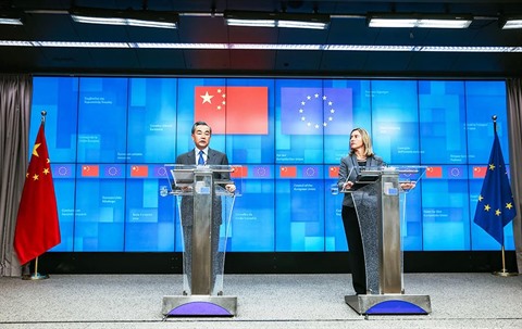 | Le conseiller d'État chinois et ministre des Affaires étrangères, Wang Yi, et la responsable de la politique étrangère de l'Union européenne, Federica Mogherini. |