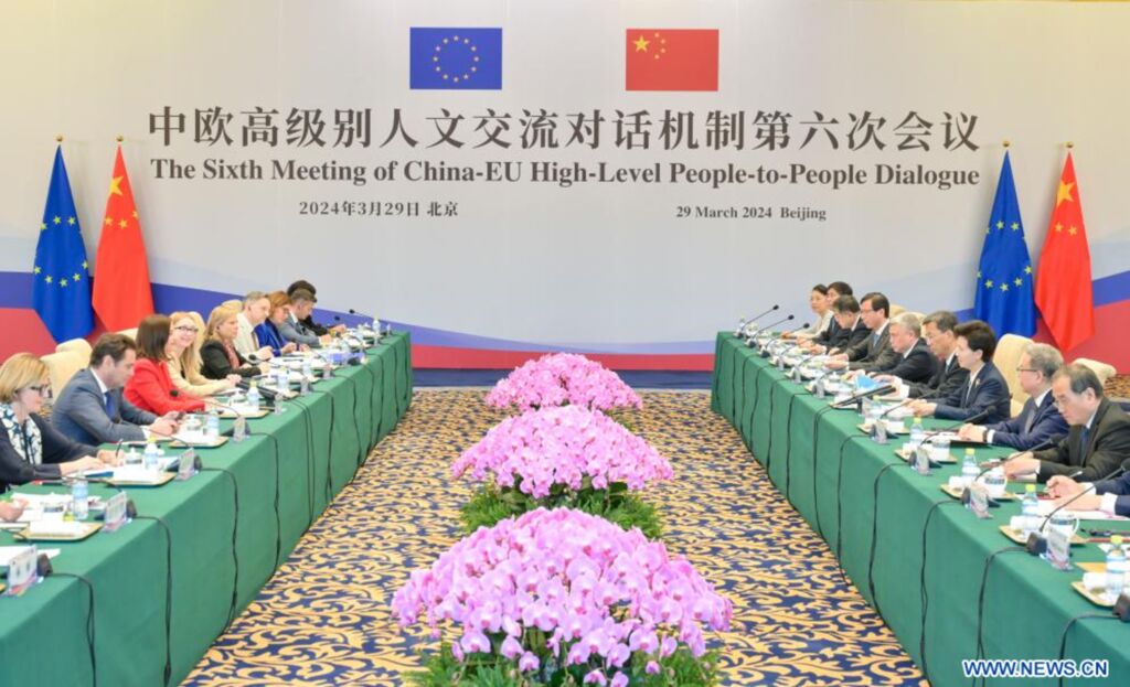 | La 6e réunion du Dialogue de haut niveau entre les peuples Chine - Union européenne, tenue le 29 mars à Pékin. |