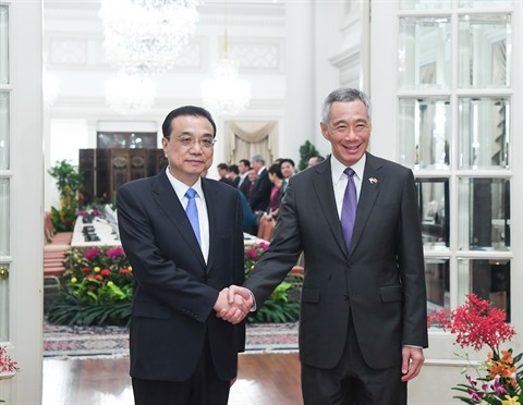 | Le Premier ministre chinois Li Keqiang (gauche) et le Premier ministre singapourien Lee Hsien Loong, le 12 novembre à Singapour. |