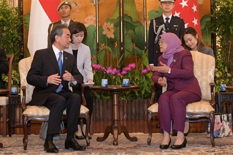 | La présidente singapourienne Halimah Yacob, et le conseiller d'État et ministre chinois des Affaires étrangères, Wang Yi, se sont rencontrés jeudi 2 août à Singapour. |