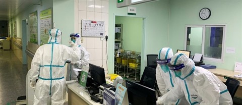 | Des membres du personnel médical en combinaison de protection à l'hôpital Zhongnan de Wuhan, le 22 janvier 2020 en Chine. |