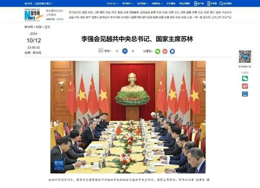 Par ailleurs, le Quotidien du Peuple rapporte également que, lors de sa rencontre avec le secrétaire général du Parti communiste et président vietnamien Tô Lâm, Li Qiang a réitéré la volonté de la Chine de collaborer avec le Vietnam pour mettre en œuvre les perceptions communes atteintes par les hauts dirigeants des deux pays. Il a insisté sur l’importance de maintenir l’amitié traditionnelle, de renforcer les contacts de haut niveau, les échanges stratégiques, et de poursuivre la construction d'une communauté d’avenir partagé sino-vietnamienne.