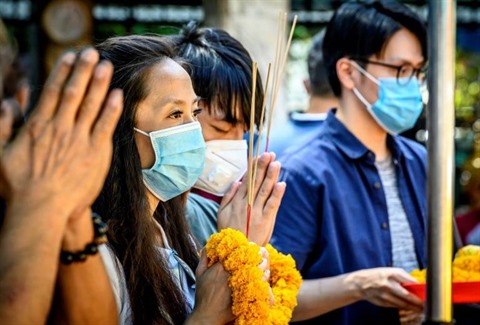 | Des fidèles avec des masques pour se protéger prient au temple Erawan à Bangkok, le 27 janvier. |