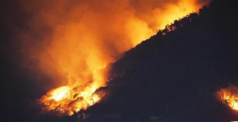 | De la fumée d'un incendie de forêt à Chongqing, en Chine, le 19 août. |