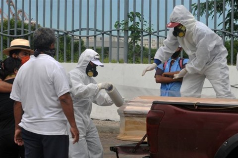 | Des employés des pompes funèbres en combinaison de protection enveloppent de plastique le cercueil d'une personne décédée du COVID-19, le 15 avril à Guayaquil, en Équateur. |