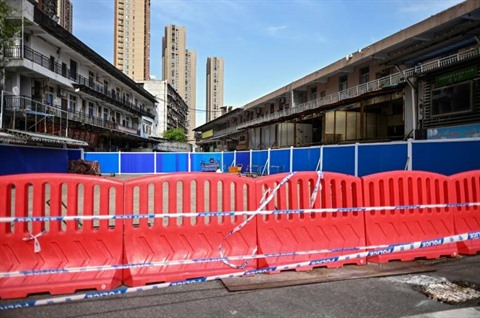 | Le marché Huanan caché derrière une palissade où le nouveau coronavirus a fait son apparition fin 2019, le 15 avril 2020 à Wuhan. |