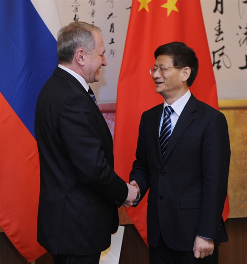 | Le conseiller d'État chinois Meng Jianzhu (droite) et le chef de la délégation russe, Vladimir Ivanovich Bulavin, le 11 avril à Pékin. Photo : XINHUA/VNA/CVN |