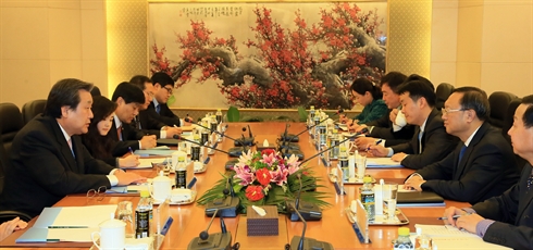 | Le ministre chinois des Affaires étrangères, Yang Jiechi (2e, à droite), et Kim Moo-sung (1er, à gauche), envoyé spécial de la présidente élue de République de Corée, Park Geun-hye, le 21 janvier à Pékin. Photo : Xinhua/VNA/CVN |