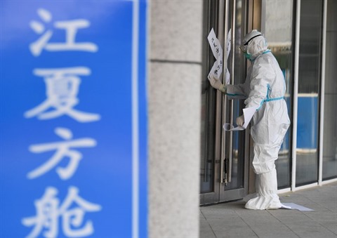 | Un employé scelle la porte de l'hôpital temporaire de Jiangxia à Wuhan, dans la province chinoise du Hubei (centre), le 10 mars. |