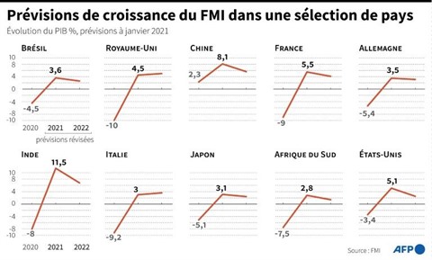 Pour 2021, le Fonds monétaire international table sur une croissance américaine de 5,1%, dopée par le dernier plan de soutien économique de 900 milliards d’USD adopté fin décembre. Il s'agirait alors de la plus forte croissance annuelle depuis 1984. Le plan de sauvetage de 1.900 milliards d’USD présenté par Joe Biden, pourrait, s'il est adopté par le Congrès, apporter 5% de croissance supplémentaire sur trois ans. La Fed table elle sur une croissance de 4,2% en 2021 et de 3,2% en 2022.