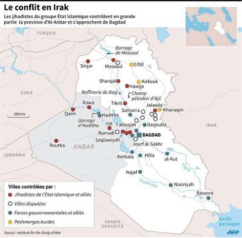 "85% d'Al-Anbar est sous contrôle de l'EI", a dit le No2 du conseil provincial, Faleh al-Issawi, en mettant en garde contre une prochaine bataille "aux portes de Bagdad".