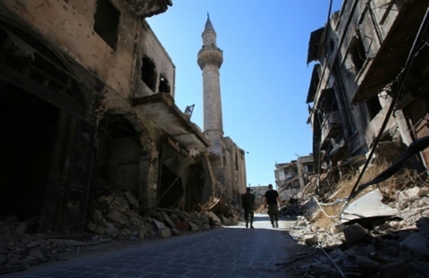 | Des soldats syriens marchent dans le souk détruit d'al-Farafira, dans la partie d'Alep détenue par le gouvernement, le 16 septembre 2016. |