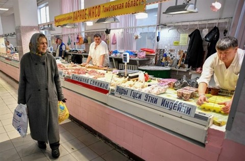 | Une femme âgée passe près d'un étal à viande, dans un marché à Moscou, le 26 février 2019. |