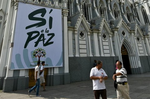 | Une pancarte "Oui à la paix" sur l'église Ermita à Cali en Colombie, le 30 septembre. |