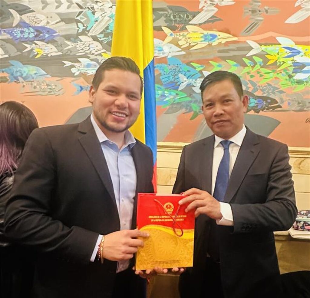 | L'ambassadeur du Vietnam au Venezuela et en Colombie, Vu Trung My (droite), et le président de la Chambre des représentants de Colombie, Andrés David Calle Aguas. |