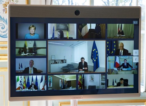 | La visio-conférence du sommet européen, vu depuis le palais de l'Élysée à Paris, le 26 mars. |