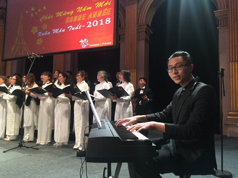 | Le chœur Quê Huong se produit lors de la célébration du Nouvel An lunaire 2018 à l'Hôtel de ville de Paris, le soir du 12 février. |