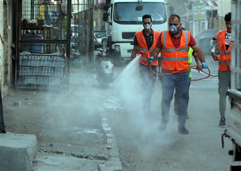| Désinfection dans une rue en Irak, le 4 avril. |