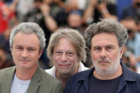 | Jean-Marie Larrieu et son frère Arnaud entourent Mathieu Amalric à Cannes le 14 juillet. |