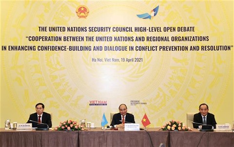 | Le président de la République, Nguyên Xuân Phuc, lors d'un débat ouvert de haut niveau de l'ONU, le 19 avril. |