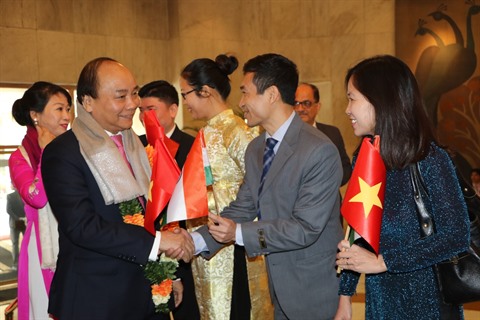 | Le Premier ministre Nguyên Xuân Phuc (gauche), le 24 janvier au siège de l'ambassade du Vietnam en Inde. |