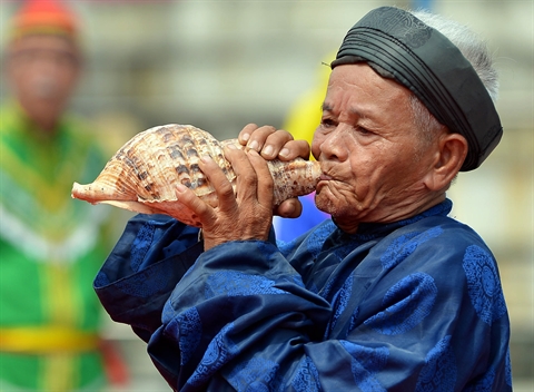 | Souffler dans la conque est indispensable lors de la cérémonie en mémoire des soldats de la Flottille royale de Hoàng Sa. |