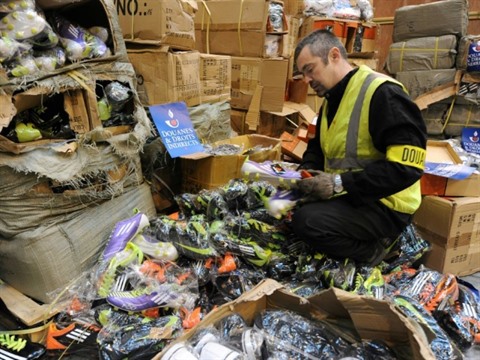 | Un douanier contrôle des chaussures de sport issues d'une saisie, le 8 décembre 2011 dans un entrepôt à Epouville, en Seine-Maritime. |