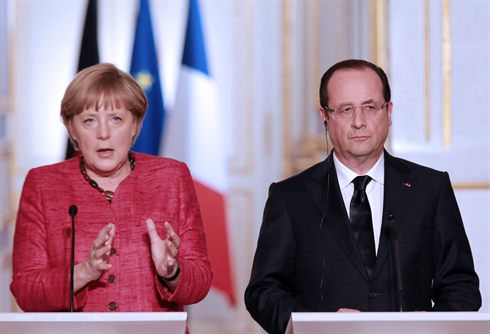 | Le président français François Hollande et la chancelière allemande Angel Merkel, lors de la conférence de presse conjointe, le 30 mai à Paris. |