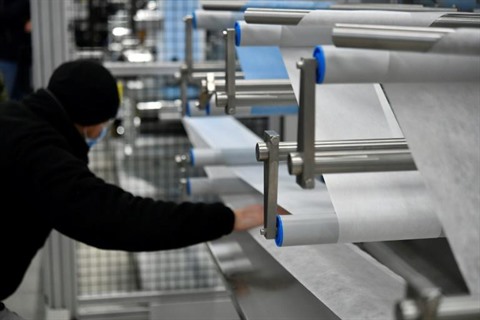 | Un opérateur surveille la ligne de production des masques à la "Coop des masques", le 26 janvier 2021 à Graces, dans les Côtes d'Armor. |