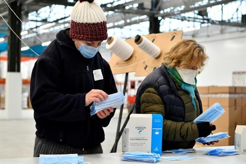 | Des opératrices emballent les masques produits à la "Coop des Masques", le 26 janvier 2021 à Graces, dans les Côtes d'Armor. |