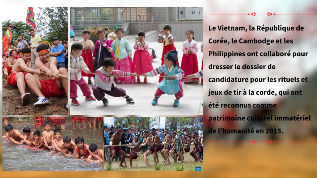 En 2013, le Vietnam, en collaboration avec la République de Corée, le Cambodge et les Philippines, a consenti à élaborer collectivement le dossier de patrimoine commun pour les rituels et jeux de tir à la corde (kéo co en vietnamien). Deux ans plus tard, cette candidature a été retenue par l'UNESCO comme "Patrimoine culturel immatériel de l'humanité". Jusqu'à présent, il s'agit du seul patrimoine multinational du Vietnam.