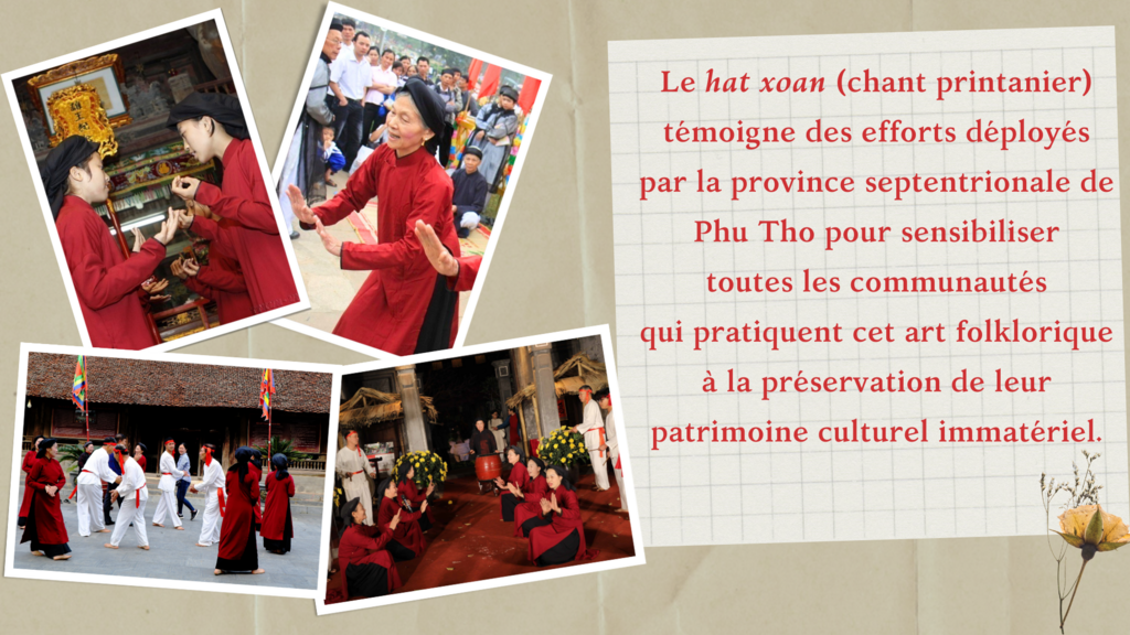 Au niveau local, Phu Tho est emblématique dans la préservation et la valorisation de son patrimoine de hat xoan (chant printanier). En 2011, cet art a été reconnu par l'UNESCO comme patrimoine culturel immatériel nécessitant une sauvegarde urgente. Depuis lors, la province s'est efforcée de mettre en place des solutions efficaces et de sensibiliser la communauté. Le résultat était encourageant : six ans plus tard, cet héritage est devenu un patrimoine culturel immatériel de l'UNESCO.