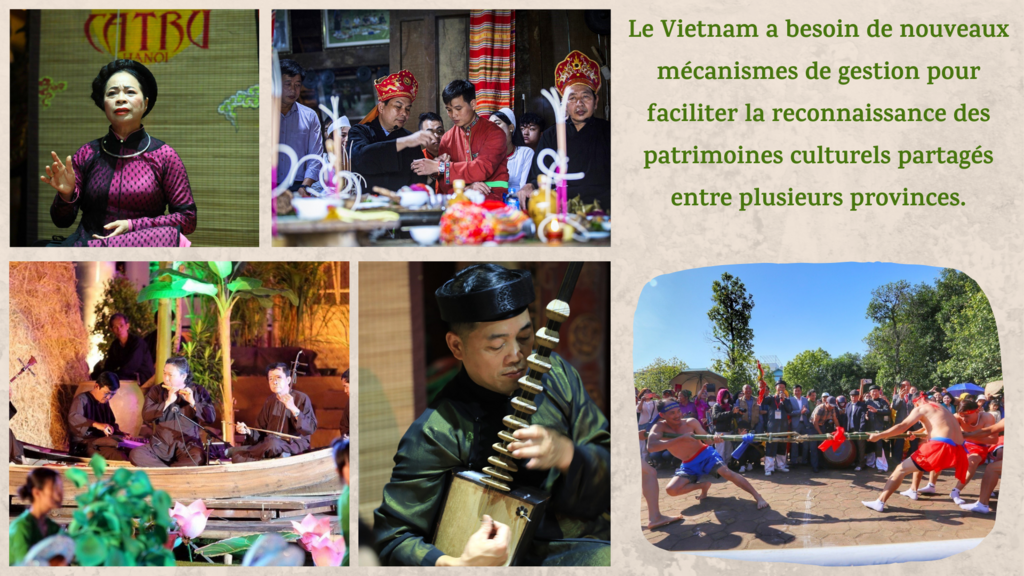 Le Vietnam compte un grand nombre de patrimoines culturels immatériels parmi les pays d'Asie. Le pays entreprend lui-même les premières étapes de la reconnaissance de ces héritages inter-locaux, inter-provinciaux ou inter-municipaux, dans le but d'associer le patrimoine matériel et immatériel et d'accélérer leur sauvegarde et leur valorisation de manière efficace et durable à long terme.