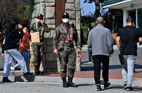 | Des militaires sud-coréens guidant des conscrits venus effectuer leur service militaire le 19 octobre à Nonsan. |