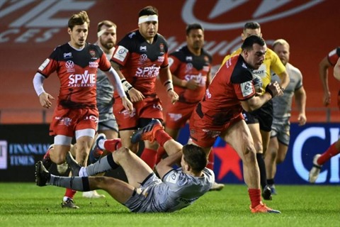 | Le pilier toulonnais Jean-Baptiste Gros tente d'échapper à un plaquage d'un joueur du club anglais des Sale Sharks, lors de leur match de Coupe d'Europe, en décembre 2020 au stade Mayol. |
