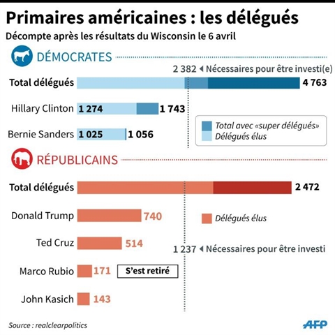 La large victoire mardi 5 avril du sénateur ultra-conservateur texan Ted Cruz dans le Wisconsin, État du Nord des États-Unis, lui permet de combler une partie de son retard en terme de délégués, mais l'écart demeure quasi insurmontable : il en a 510, contre 743 pour Donald Trump. La majorité absolue est de 1.237.