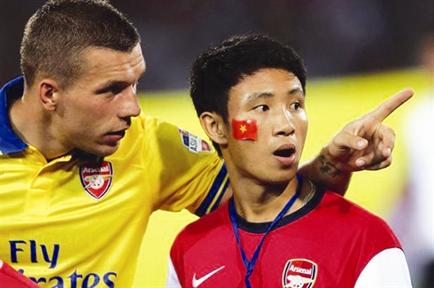 | Vu Xuân Tiên aux côtés de Lukas Podolski juste avant le coup d’envoi du match Vietnam - Arsenal, le 17 juillet au stade My Dinh, à Hanoi. |