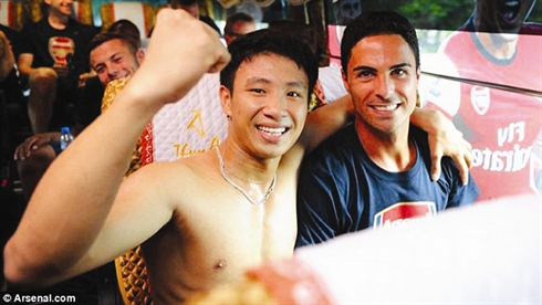 | Vu Xuân Tiên savoure sa «victoire» en prenant la pose dans le bus des Gunners avec Mikel Arteta. |
