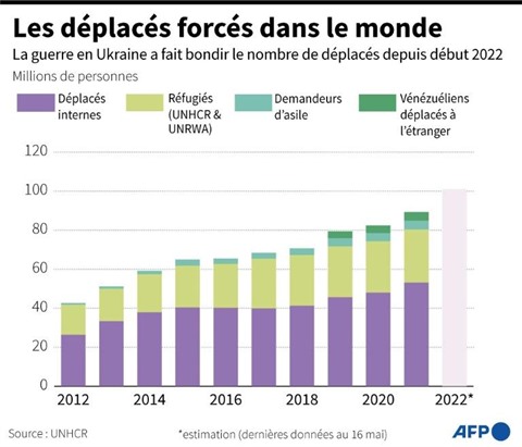 Fin 2021, le monde comptait 89,3 millions de réfugiés et déplacés internes, plus de deux fois plus qu'il y a 10 ans, dont 53,2 millions de déplacés internes et 27,1 millions de réfugiés.
