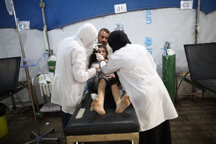 | Une agente de santé examine un enfant dans un hôpital de campagne de la ville de Rafah, dans le sud de la bande de Gaza, le 8 janvier. |