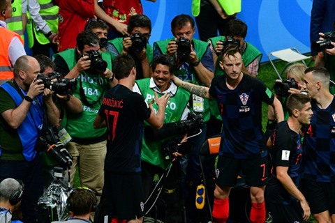 | L'attaquant croate Mario Mandzukic (gauche) serre la main du photographe de l'AFP Yuri Cortez (centre), le 11 juillet 2018 à Moscou. |