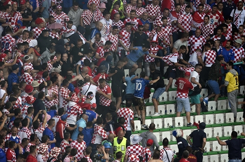 | Bagarre entre supporters croates et tchèques lors du match de l'Euro-2016 opposant leur deux équipe à Saint-Etienne, le 17 juin 2016. |
