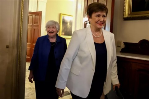 | La directrice générale du FMI, Kristalina Georgieva, suivie de la secrétaire américaine au Trésor, Janet Yellen. |