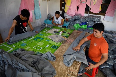 | Des travailleurs produisent des équipements de protection individuelle à Jakarta, en Indonésie. |