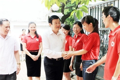 | Le président du Vietnam Truong Tân Sang travaille le 15 juillet avec les cadres de la Croix-Rouge du Vietnam. |