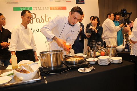 | Le chef de l'hôtel Caravelle Saigon, Ivan Barone, montre comment cuisiner de manière authentique les pâtes italiennes lors de l’événement. |