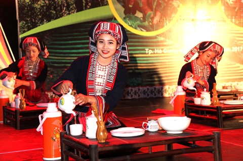 | Des filles Dao lors d'une soirée en l'honneur du thé organique, en janvier 2017, dans la province montagneuse de Hà Giang (Nord). |