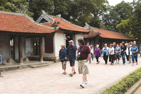 | Des touristes étrangers au Temple de la Littérature à Hanoï. |