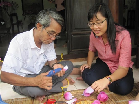 | Lundi 20 juillet, les étudiants se sont essayés à la fabrication de lotus en papier dans le village de Thanh Tiên, près de Huê (Centre). |