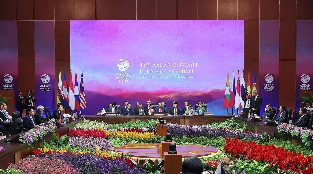 | Séance plénière du 43e Sommet de l'ASEAN. |